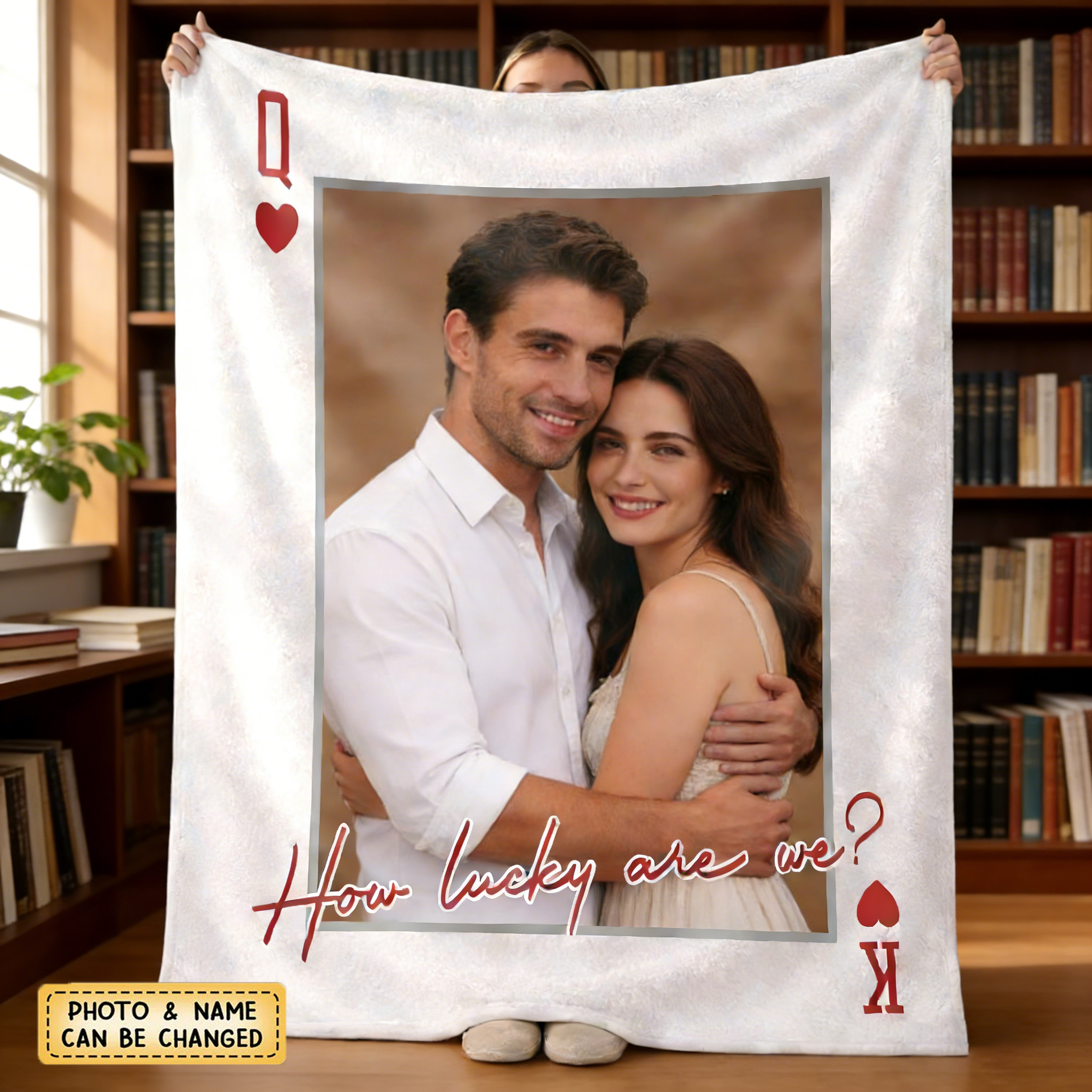 This Personalized Couple Portrait Blanket features a highly creative playing card design, symbolizing the perfect match of two souls destined to be together. You can upload a cherished couple's photo and pair it with the touching quote, "How lucky are we?", weaving your warm memories into the soft fibers. This is not just a warm blanket for your home, but also a unique emblem witnessing your "eternal love."
