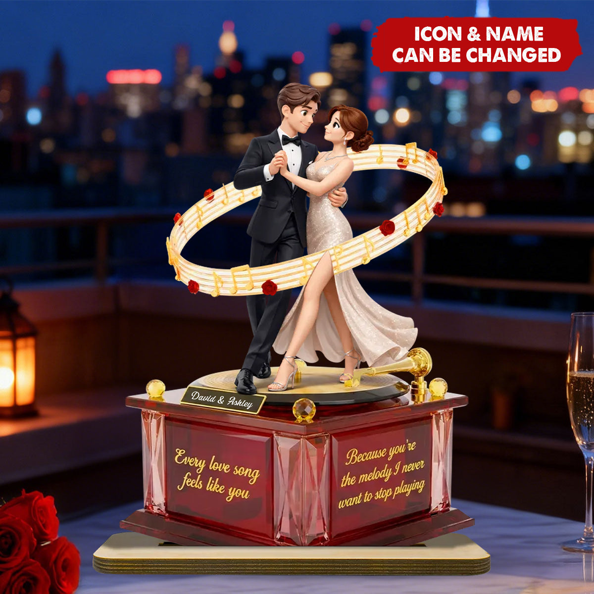 Celebrate your love story with this exquisite Personalized Dancing Couple Music Box Plaque. This romantic 2-layered wooden keepsake features a beautifully sculpted couple dancing beneath a swirl of musical notes, embodying the quote, "Because you're the melody I never want to stop playing." Customize the base with your names and a date to create a one-of-a-kind anniversary gift.