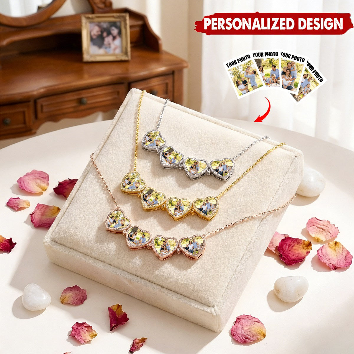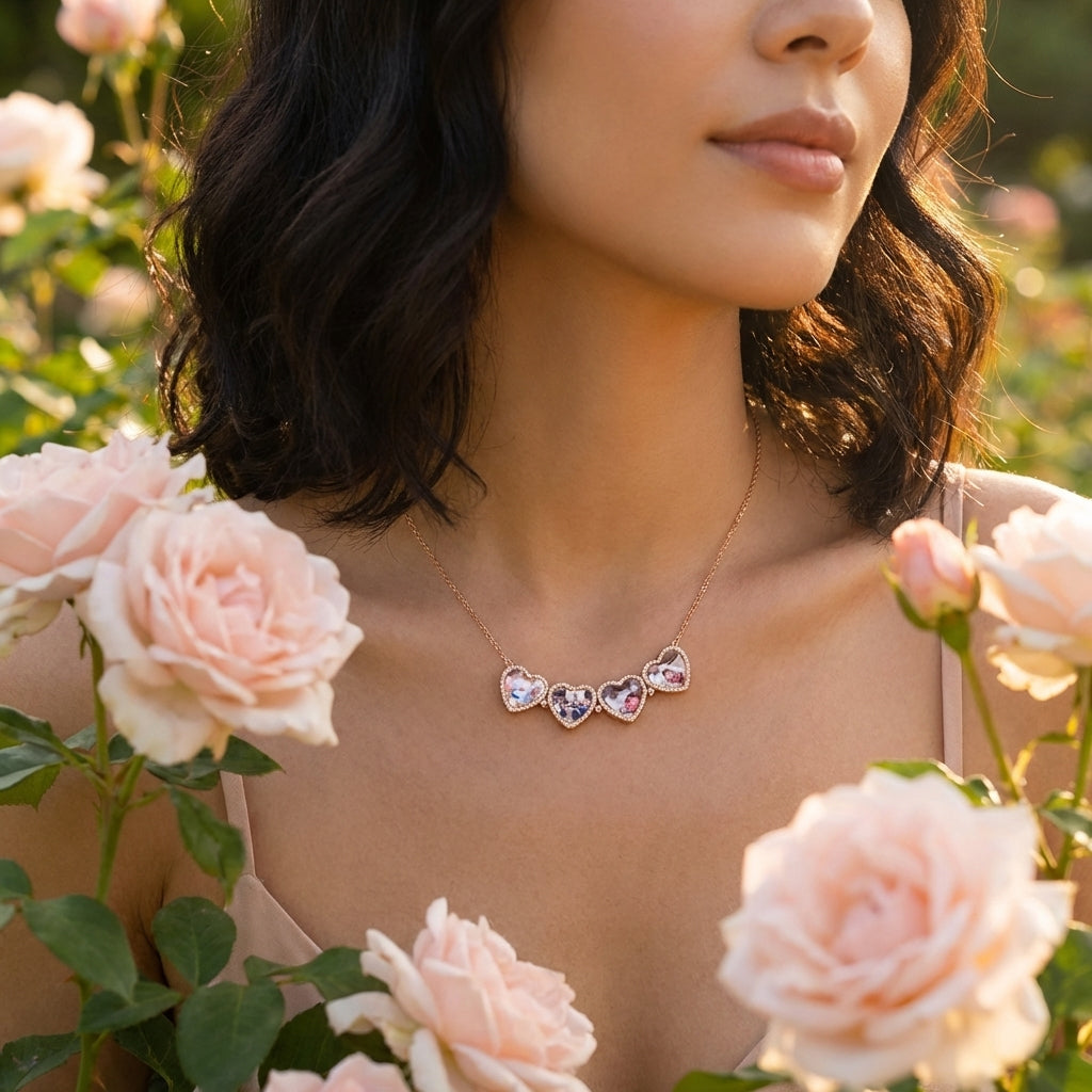 This customizable photo locket necklace, shaped like a four-leaf clover or heart, can hold four personalized photos. It's a commemorative piece of jewelry that carries family memories and emotions, perfect for gifting to a mother, partner, or close friend.