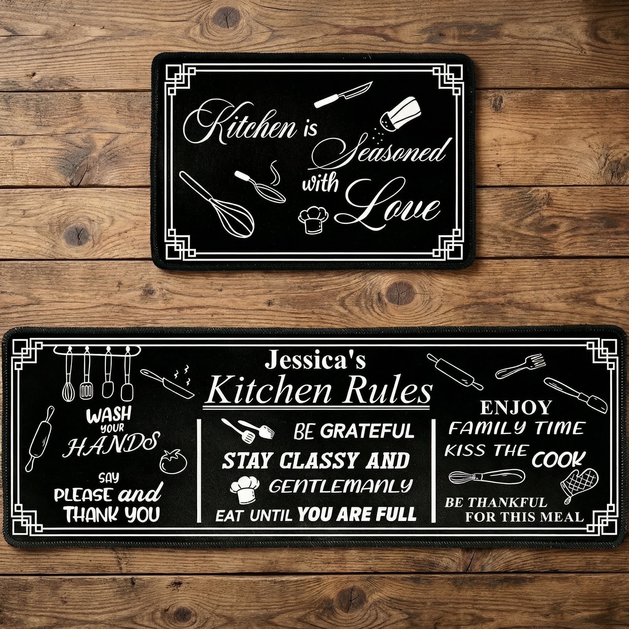 Step onto a rug that tells your family story. Our Personalized Kitchen Rules Runner is the perfect blend of farmhouse aesthetic and personal sentiment. Featuring a charming wood-plank design and a collection of "rules" that celebrate love and laughter, this customized floor mat turns a functional space into a warm, welcoming gallery. It’s the ultimate way to mark your territory in the most delicious room of the house.