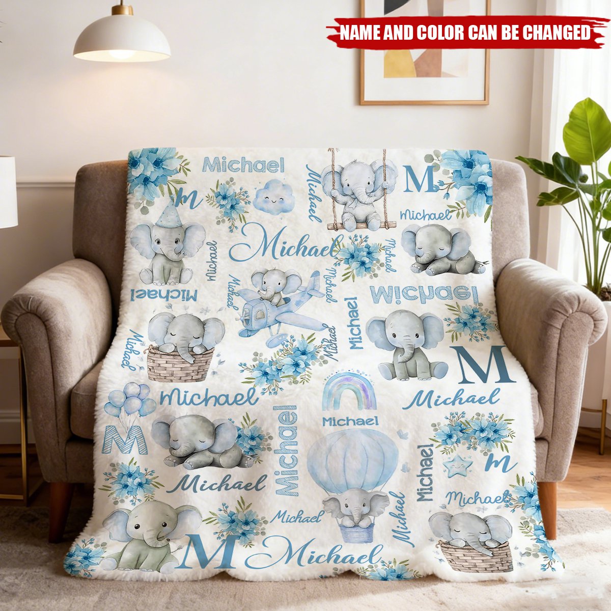 Personalized Ultra-Soft Elephant Illustrations Fleece Nap Blanket With Name & Color - Birthday Keepsake Newborn Shower Gift For Baby