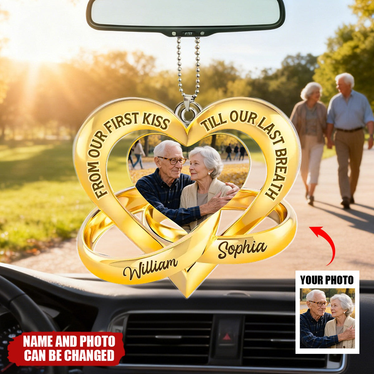 This custom photo car ornament, engraved with 'From our first kiss, till our last breath', is a tender reminder of the simple, steadfast bond you share. Personalized with your names and a cherished photo, it turns every drive into a sweet reflection of the journey you're building together—mile by mile, memory by memory.