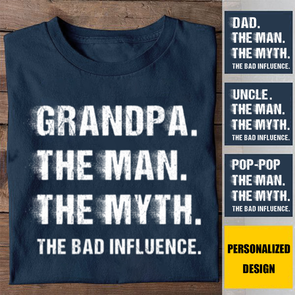 Unleash the legend with this hilarious Personalized "The Man The Myth The Bad Influence" T-Shirt! This custom printed tee is the perfect way to honor the family member who is always fun, slightly reckless, and full of great stories. Make it special by customizing the title (Dad, Grandpa, Uncle, Pop-Pop, etc.) at the top. It's the ultimate funny gift for Father's Day, Christmas, or a Birthday.