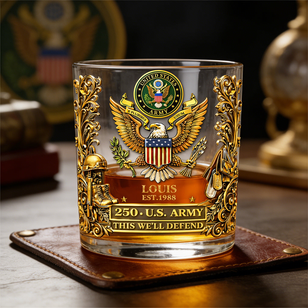 Honor the hero in your life with a tribute that’s as strong as their spirit. Our Personalized 250th Anniversary U.S. Glass is a masterpiece of patriotic craftsmanship. Every detail, from the soaring golden eagle to the official "Aim High" motto, is designed to capture the pride of those who have served under the stars and stripes. This isn't just a military whiskey glass.