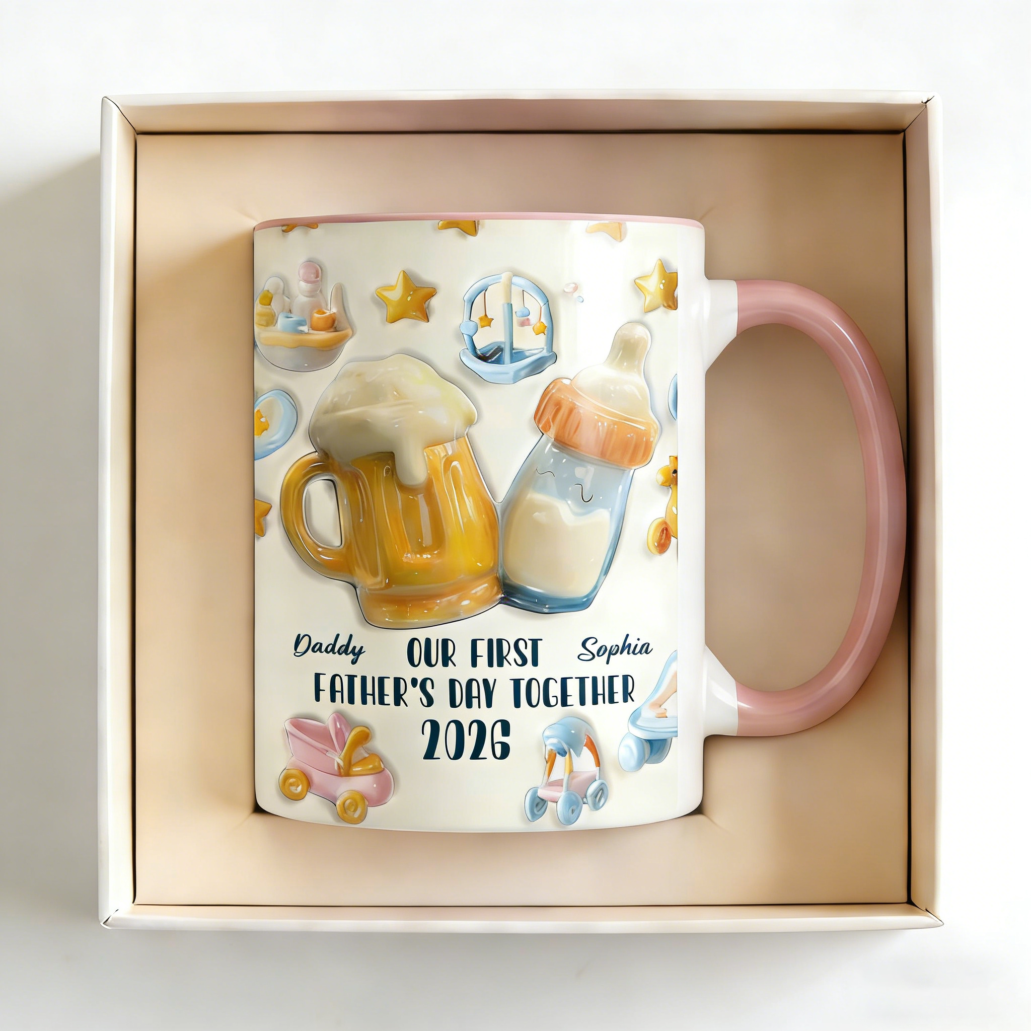 Remember those late-night toasts and drinks? Now, those glasses have been replaced by baby bottles, and the cheers by the cries and laughter of your little one. This Personalized "Our First Father's Day" Accent Mug is designed to celebrate this brave and tender transformation.